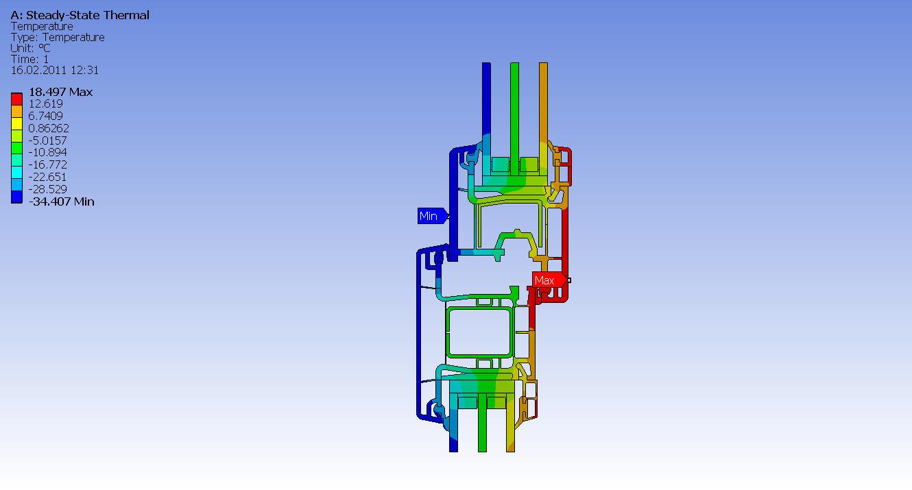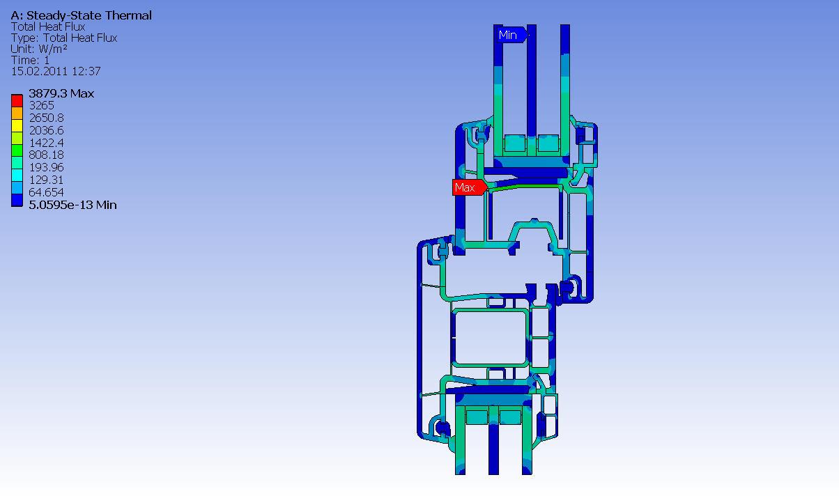 Решение задачи о распространение тепла в сечении оконного профиля - стационарная постановка 1. Сетка КЭ 2. Распределение температуры 3. Распределение плотности теплового потока внешняя температура -35 внутренняя температура + 20 В связи с тем, что решалась ЛИНЕЙНАЯ задача в стационарной постановке. *** сетка КЭ не очень "плотная", но вполне достаточная для хорошей интерполяции полученных результатов. Теплопроводность всех материалов (в том числе и воздуха) задавалась как функция от температуры, что оказалось весьма важным. Не учет этого факта - как показали расчеты может дать "отклонение" до 10%, а в отдельных случая до 15% в модели отражено РЕАЛЬНАЯ передача тепла через поверхности контакта тепла - т.е. использовались РЕАЛЬНЫЕ - полученные из экспериментов - значения теплопроводности для контактов между различными материалами. Как показали расчеты - не учет этого фактора может вносить ошибку до 10% Коэффициенты теплопередачи на внешних поверхностях - принимались как "константы" - постоянные численные значения, так и функции температуры материала и\или воздушного потока. Результаты расчетов по "первого" варианта конструкции профиля окна, сравнивались с натурными экспериментами - которые проводил заказчик. "Отличие" результатов расчетов от экспериментальных данных не превышали 5-6%. Результаты расчета помогли "заказчика" подобрать оптимальным размеры и материалы. ======================================================= Был проведен "тестовый" расчет по определению коэффициента теплопередачи Решалось две задачи 1. "внешняя" задача аэродинамики здания - с целью определения ветрового давления на ограждающие конструкции и получения "общей" картины течения вокруг здания в стационарной постановке 2. "Локальная" задача обдува окна - с целью получения РЕАЛЬНЫХ значений коэффициента теплопередачи по площади окна и прилегающей области стены - 1 метр во все стороны от внешнего периметра окна. К сожалению , заказчик не дал разрешения публиковать результаты расчетов, а выполнять такие расчеты - бесплатно - для статьи - пока нет времени. Однако можно совершено однозначно утверждать - что коэффициент теплопроводности - не может рассматриваться как константа по площади окна - при наличии "сильного" ветра. ======================================================== Полученное распределение температур по сечению и проведенные термопрочностной расчет - показал, что при разнице внутренней и наружной температур - имеют место деформации, которые могут оказывать влияние на теплопроводность "контактов" между элементами окна.